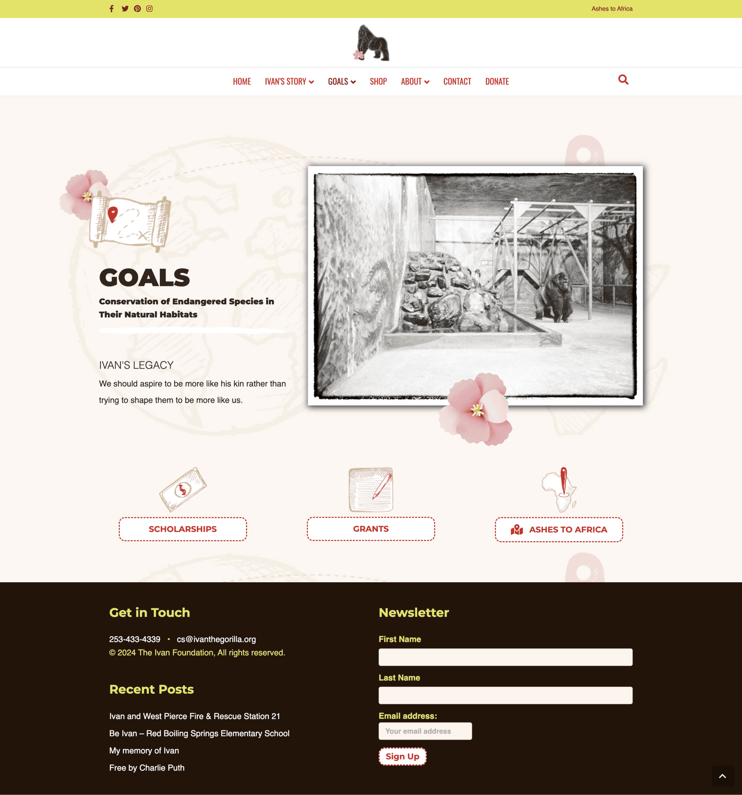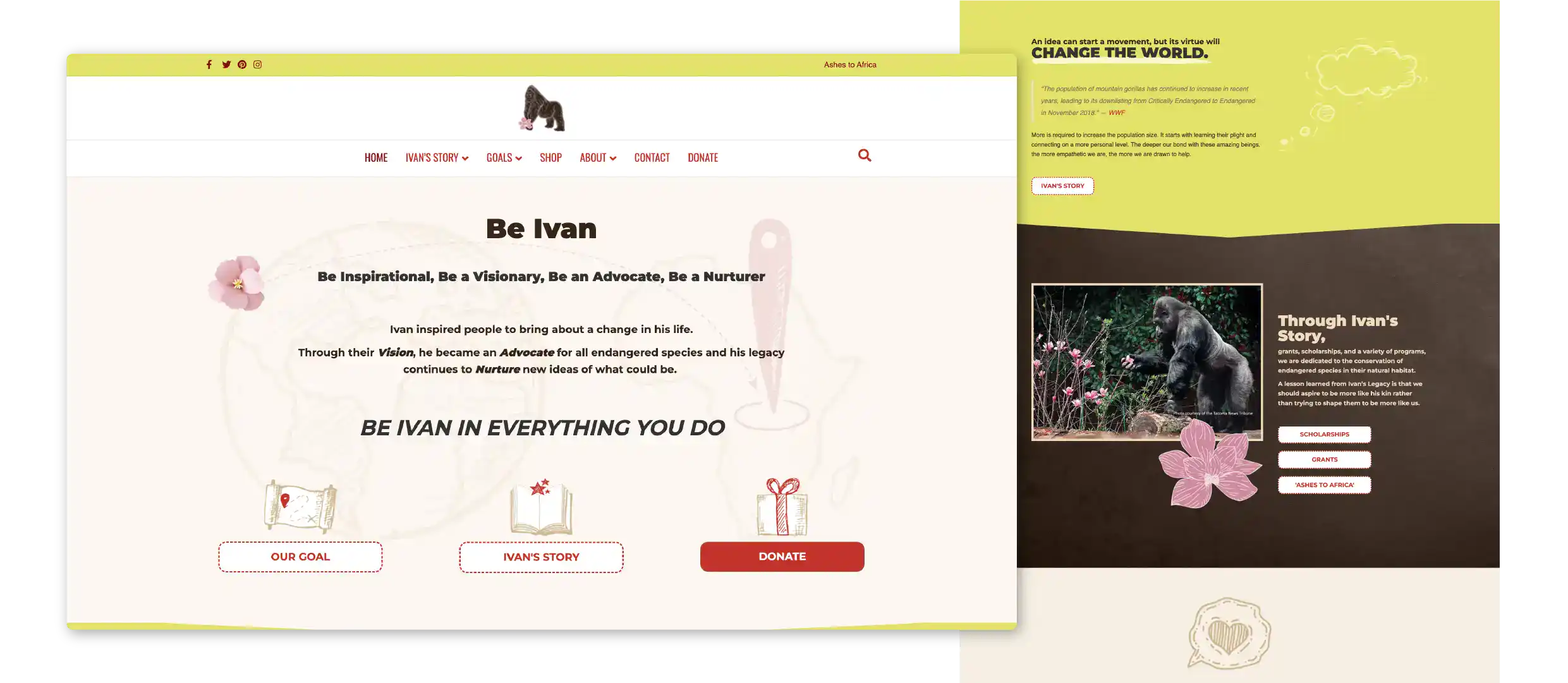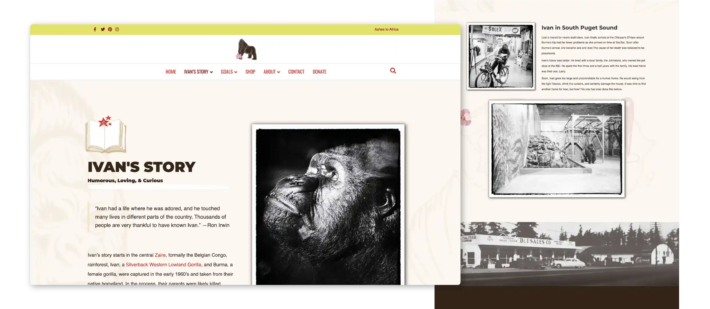 A Digital Storybook & Conservation Hub: We re-engineered the digital experience to be an interactive bridge between Ivan’s history and the foundation's future goals. "Scrapbook" Visual UX: I moved away from sterile web design, instead utilizing Ivan’s most gentle photos within a "storybook" layout. This hand-crafted feel evokes a sense of personal history and "real life," making the experience approachable for both adults and children. Hand-Drawn Interactivity: To engage younger audiences, I incorporated hand-drawn icons and organic design elements. This creates a tactile, immersive environment that invites exploration rather than just passive reading. SEO & Domain Migration: We successfully executed a complex domain migration and "permanently redirected" the old site architecture. This preserved years of SEO value while aligning the brand with a more recognizable, legacy-focused URL. Integrated Fundraising & E-commerce: We implemented a robust donation system via GiveWP and a print-on-demand e-commerce model. This allowed the foundation to scale its merchandise variety without the overhead of physical inventory, funding their mission to return Ivan's ashes to the Congo.